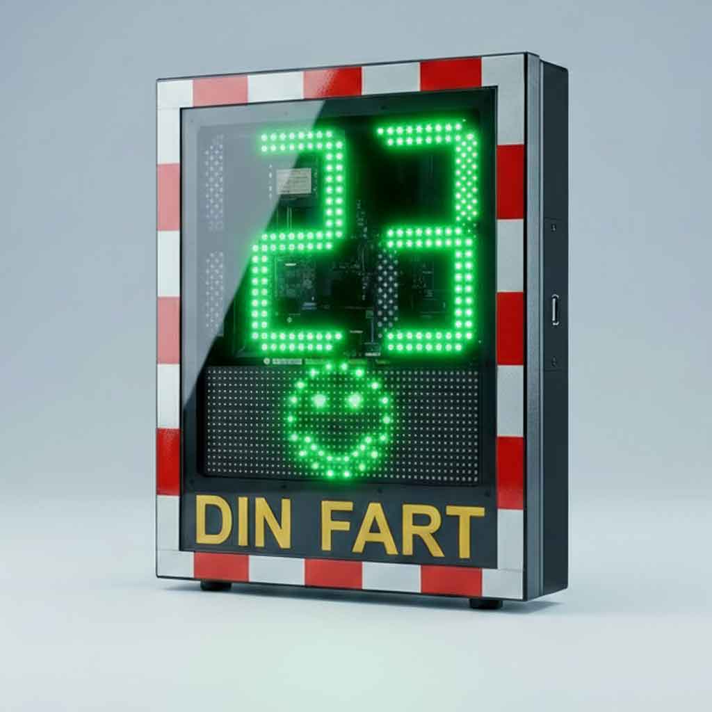 • Vår fartskylt har även möjligheten till dels ”smiley” en glad eller arg ansiktsfigur emoji beroende på om man håller hastigheten eller kör för fort.